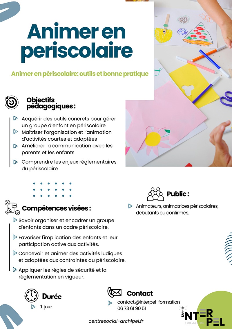 Pour vous inscrire ou avoir davantage de renseignements sur notre formation « Animer en temps périscolaire : outils et bonnes pratiques », merci de contacter Interpel Formation :
