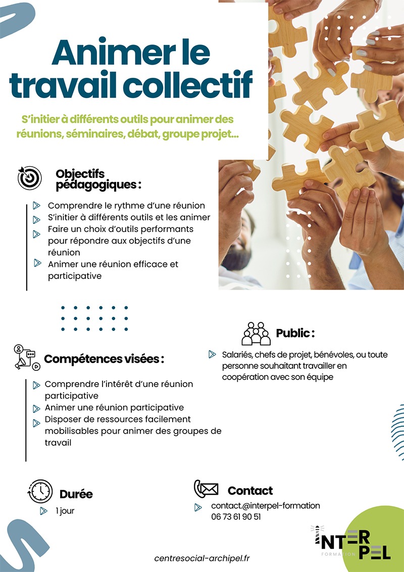 Pour vous inscrire ou avoir davantage de renseignements sur notre formation « Animer le travail collectif : s’initier à différents outils pour animer des réunions, séminaires, débats, groupes projet, … », merci de contacter Interpel Formation :